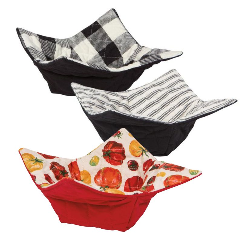 Tired of bowls that are too hot to handle out of the microwave? You need a bowl cozy! Place your bowl of soup in this microwave-safe bowl cozy, toss it in the microwave at 50% power and when it’s done, pick it up using the cool-to-touch cozy instead of the hot bowl. It keeps your soup warm as well. It’s reversible and machine-washable. Do not leave in microwave unattended.
