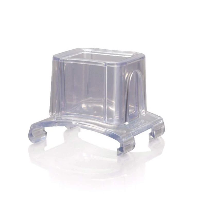 This food guard slips on to the rail of the Gourmet Series Paddle Graters (except the Ultra Coarse Grater). Drop smaller foods, like garlic, ginger, chocolate chips, nuts, and small veggies into the hopper, push down on the plunger and grate! This accessory helps to easily grate these foods without putting your fingers in the way of the ultra-sharp blades.